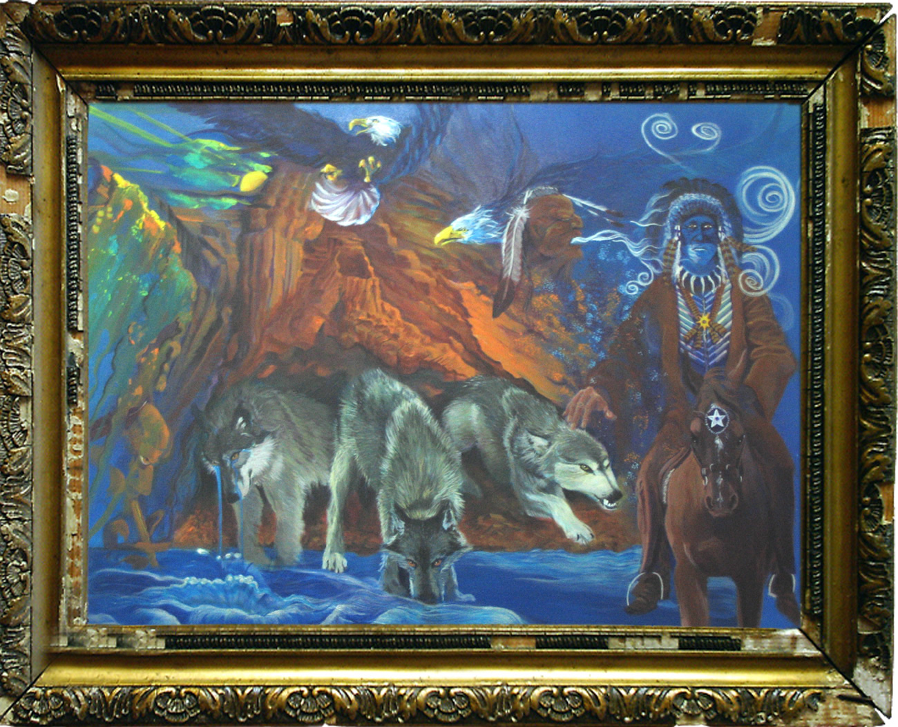Forces of Nature, 1997 Media: Acrylic This painting was commissioned by an indian friend. The wolves in the painting represent pain, acceptance and offense. The first wolf pours out tears which
